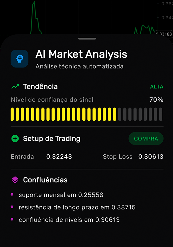 O IA Market Analysis da EBX foi criado para levar todo o potencial da inteligência artificial diretamente para dentro do APP, transformando a forma como o mercado é lido e como as operações são conduzidas. Em vez de depender apenas da interpretação manual de gráficos, o sistema utiliza modelos avançados que identificam a direção provável do preço e atribuem um nível de confiança ao movimento, oferecendo uma visão clara sobre a força de cada tendência.